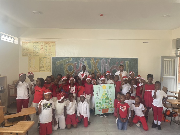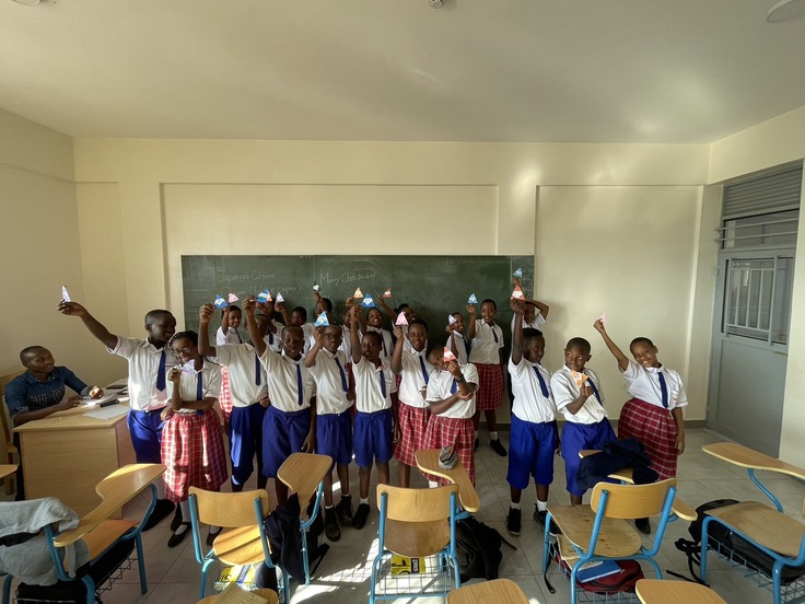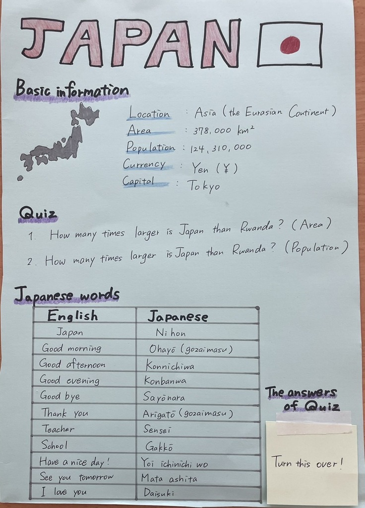 活動先の私立小学校では、子ども達から日本語を教えてほしい!という要望があったので、日本に関する資料を作成し、全教室に掲示しました。簡単な日本語のフレーズを練習するだけでなく、地球儀を使ってルワンダと日本の場所を確認してみると、日本が島国であることにとても驚いていました。6年生のクラスでは、面積や人口について、日本がルワンダの何倍か、式をたてて実際に計算をするなどもしました。