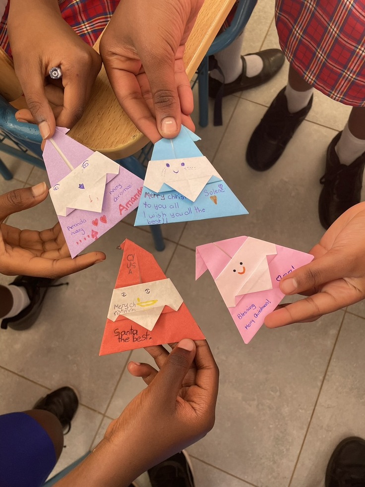 日本語の練習だけでなく、日本文化として折り紙を小学4~6年生に体験してもらいました。クリスマスが近かったので、サンタクロースを作成しました。折り紙を終えた後は、顔を書き入れオリジナルサンタクロースを作成しましたが、あまり自分の作品を作る、という機会がないので、みんなとても喜んでくれました。中には家で紙を正方形にし、「もう一個作った!」と見せに来てくれた子もいました。3年生は、1人1枚紙にお願いごとを書き、クラス全体で1つのクリスマスツリーを作成しました。