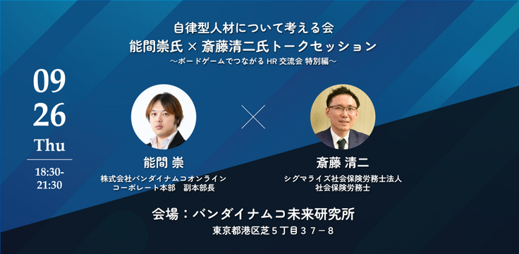 バンダイナムコオンラインの能間様とシグマライズ社会保険労務士法人の斎藤様をお呼びして"自律型人材"についてお話いただきます。その後、参加者のみなさんで自律型人材育成ゲーム「TEAMCLIP」をプレイしていただき、"自律型人材"というキーワードに対してインプットとアウトプットの両軸を行っていただくことができるイベントとなっております。