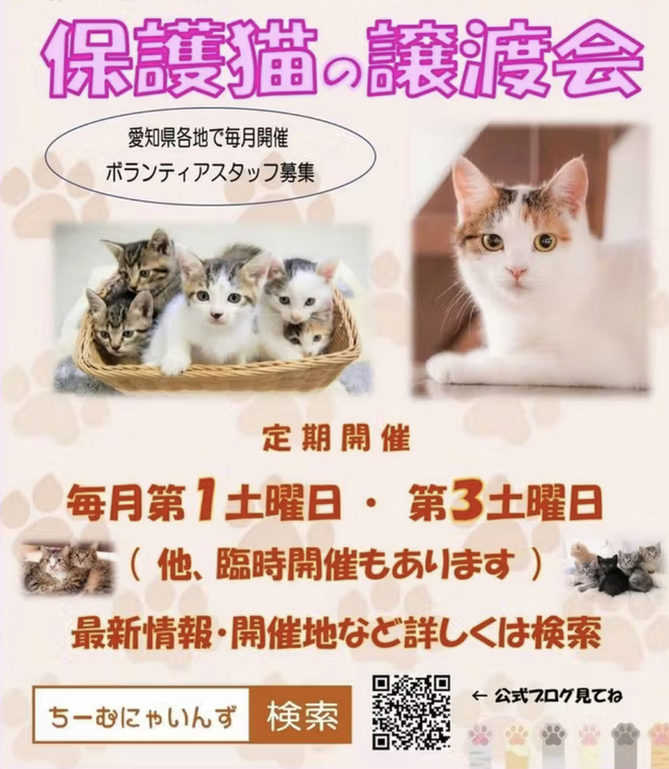 保健所に持ち込まれた猫たちの保護や、 地域猫のTNR活動、多頭飼育崩壊現場からの 保護を行い、愛知県を中心に毎週末 譲渡会を行なっております。 現在、預かりボランティアさん、ミルクボランティアさん募集中です。