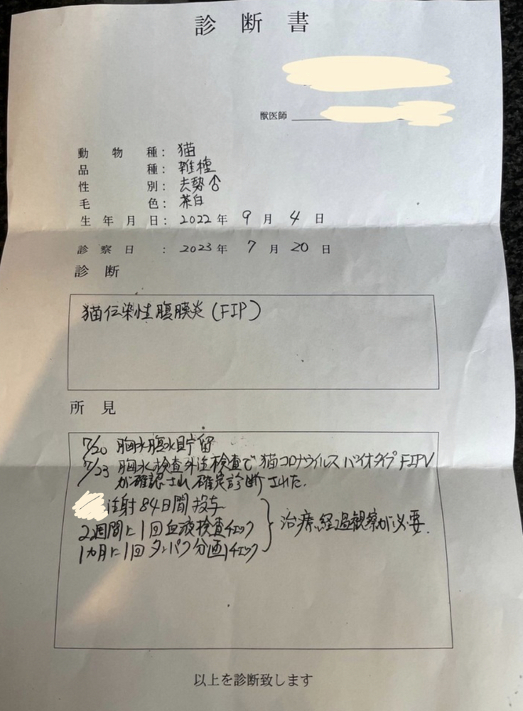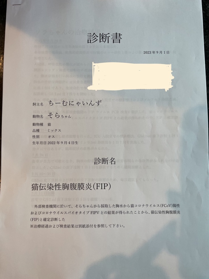 7/23 胸水検査外注検査で猫コロナウイルス