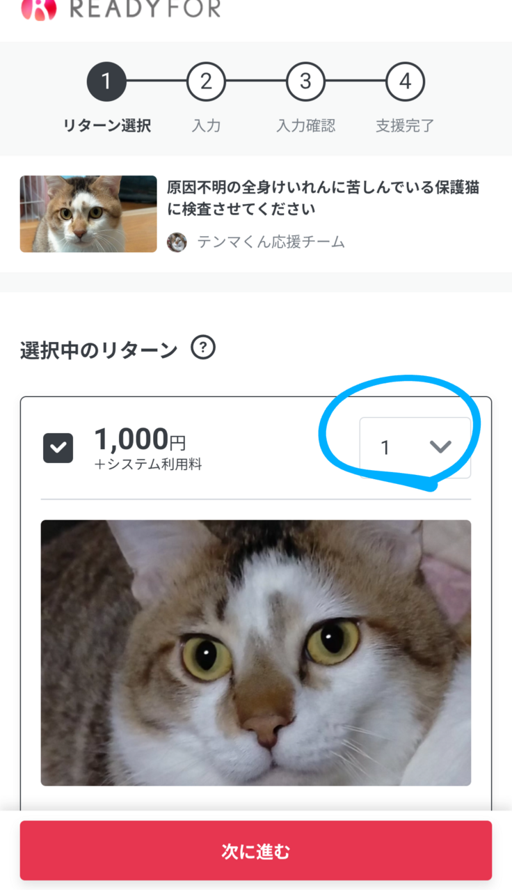 この場合は、例えば1,000円のリターンのところでご説明いたしますと、チェックのあとに口数を選んでいただきますと、ご希望金額でのご支援が可能です。