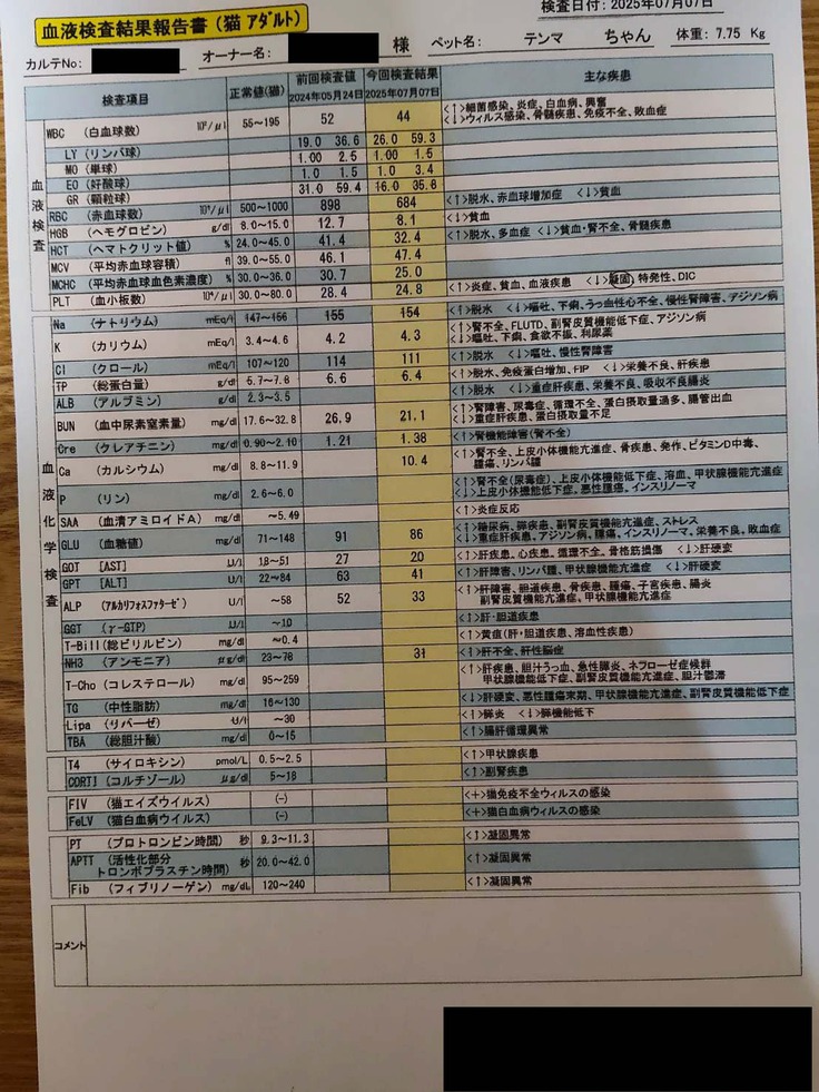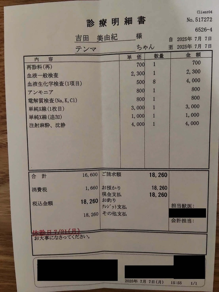 7月7日(月)に、地元の病院(A動物病院)にて麻酔前検査【MRI検査の事前検査】を受けました。