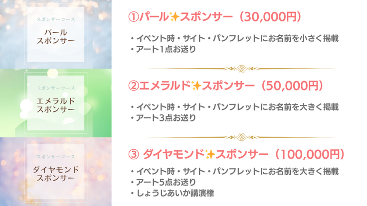 ※プロジェクト成立後、天災等やむを得ない事情(緊急事態宣言などコロナウイルスによる影響を含む)によりイベントが開催できなかった場合、いただいた支援金は次回のイベント開催費用に使用いたします。