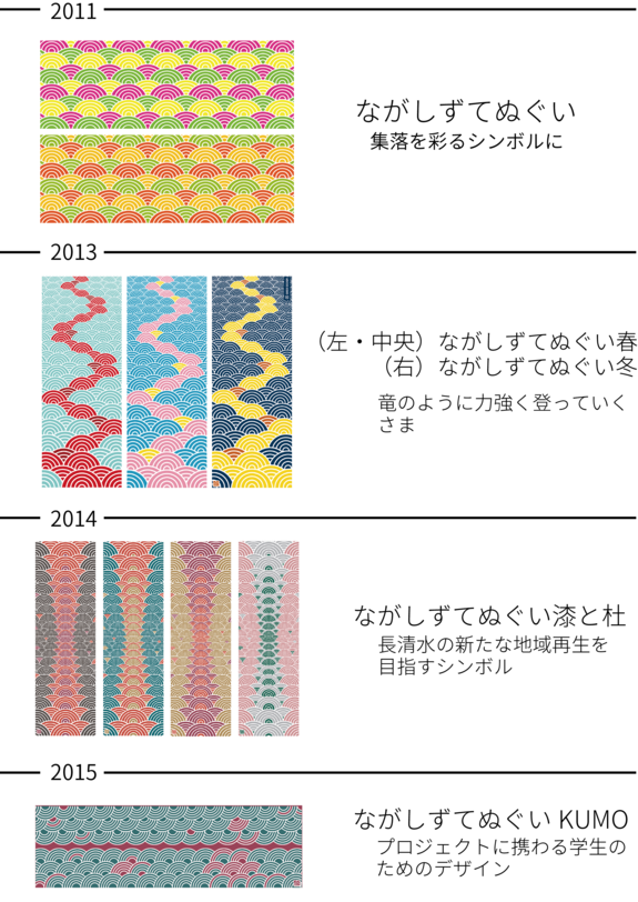長清水集落には、震災前と変わらずまた海とともに生きていきたいという思いから、復興作業をしている方がたくさんいました。そのため、海をモチーフにした古典柄”青海波(せいがいは)”をデザインに取り入れました。この青海波はながしずてぬぐいのアイコン的図案として代々受け継がれています。また長清水の方々が頭や首にカラフルなながしずてぬぐいを巻くことで、気持ちを一つにする助けになること、集落を彩る復興のシンボルとなることを目的として制作したのが始まりでした。