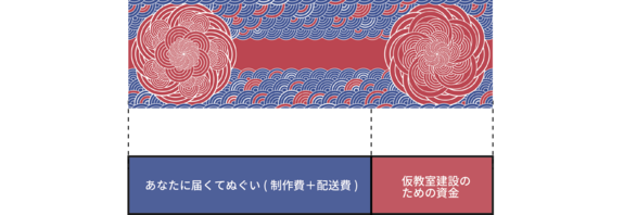 私達は同じ学生だからこそ、子どもたちの学ぶ場所を確保したいと思い、仮教室の設置という支援の形としました。その仮教室には皆様に支援していただいた証として、てぬぐいと同じデザインのサインボードを設置して頂く予定です。