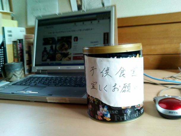 昨年、南洲伏見園でこども食堂を始めたばかりのころから、この活動に関心をもっていただき、さっそくカウンターに募金缶を設置してくださったのです。