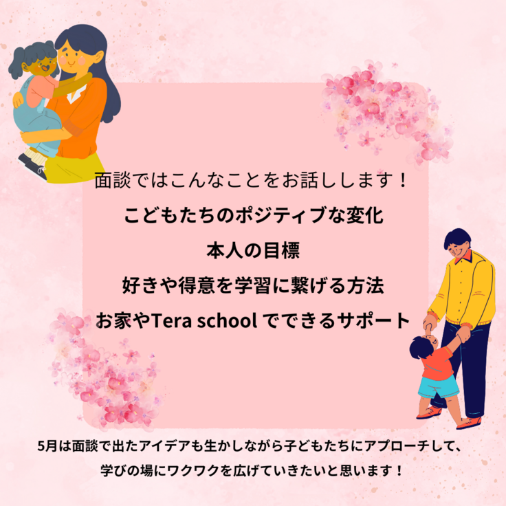 子ども自身の意志や個性を尊重するのが大前提ではありますが、やはり「やり抜く力」を育てるようなアプローチも大切なので、面談では保護者の方と目線を合わせて、子どもたちの「好き」や「得意」を日々の学習につなげる方法なども検討しています。保護者の方にとっても Tera school のスタッフにとっても、保護者面談は気づきが多く楽しい時間です。