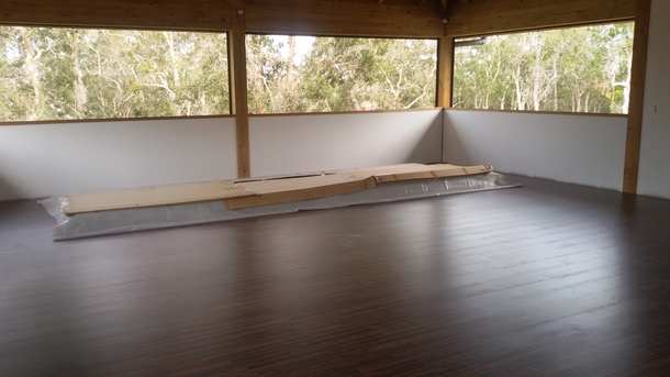 夫と手作りしてきた道場は、2017年11月9日時点、ほぼ完成です。あとは上座を作り、ミラーを取付ければ完了です。