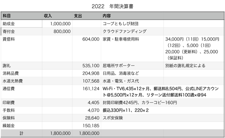 助成金をいただき、家賃やサポーターの謝礼に充てることができたため、支援金の残金は、令和5年度に繰越し、家賃・水道光熱費の支払いに充てます。