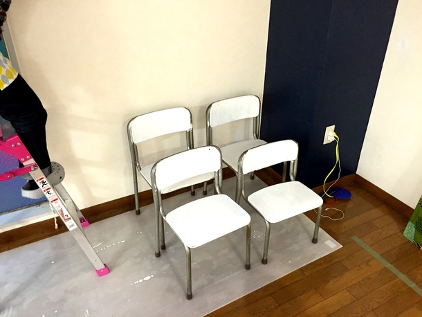 でもそれも、味わいです。古い学校から引き取った、サイズもバラバラな教室のイス11脚が、ペンキの鬼・めぐちゃんの手により新たな息吹を吹き込まれました。