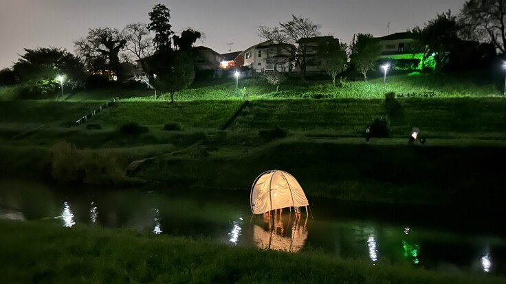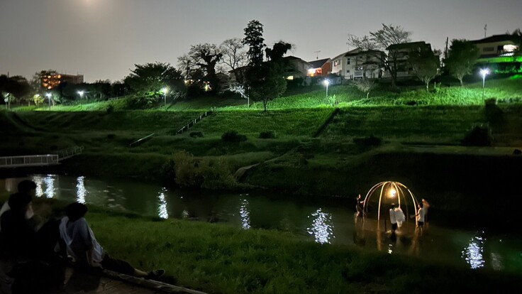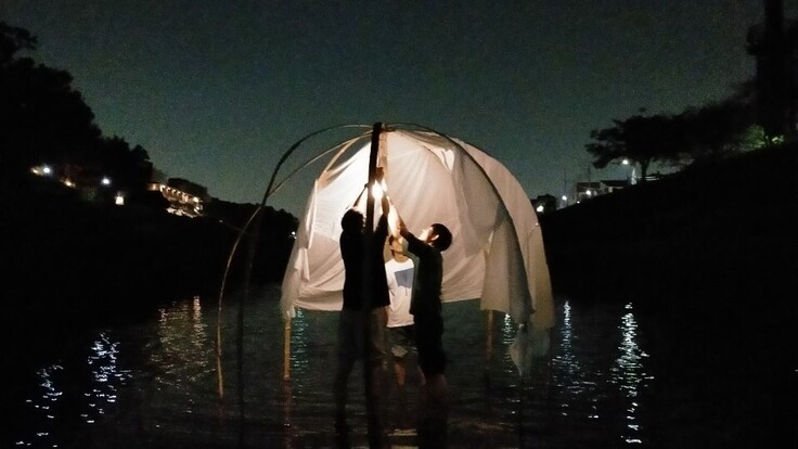 8月の地域説明会では陸上でしか展示していなかった『くらげ』を水面に浮かばせることになりました。実際に利根運河に入っての試行錯誤は、大学の授業終わりの夜が中心で、なかなか視界が良くない中での作業となります。仲間と声を掛けながら完成した『くらげ』は陸上に置くのと比べて格別でした。