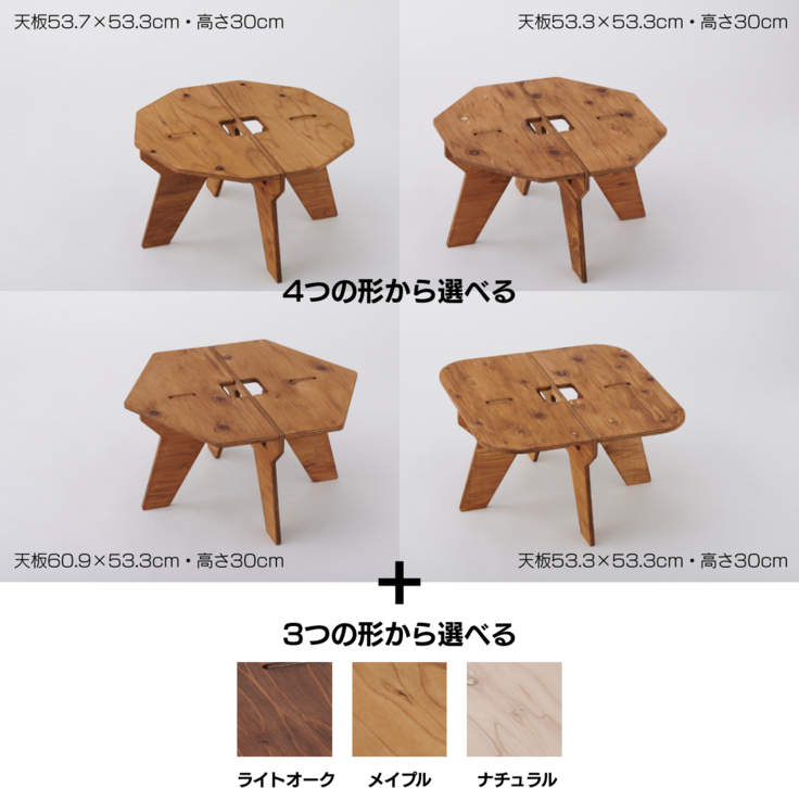 これらの「2アクションテーブル」は木製(針葉樹合板12mm)で作られています。
