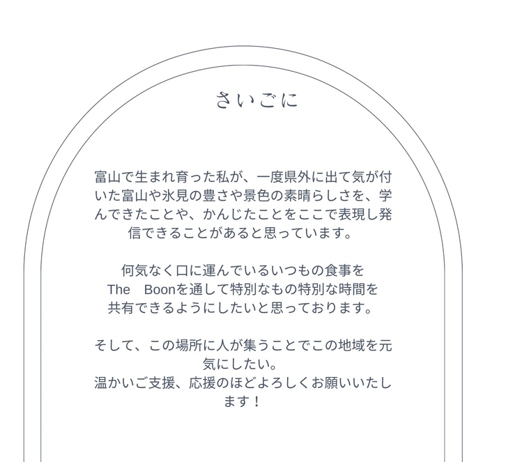 英語で「Boon」は名詞で恵み、恩恵、形容詞でおもしろい、愉快なという意味があります。・a grateful boon ありがたい贈り物・a boon companion 愉快な仲間 この環境でできることや食べ物の恵みに感謝して愉快でたくさんの人の憩いの場になれば幸いです。 もう一つは海の音です「ザブーン」とキャッチーでたくさんの方に愛されるお店作りを目指します。