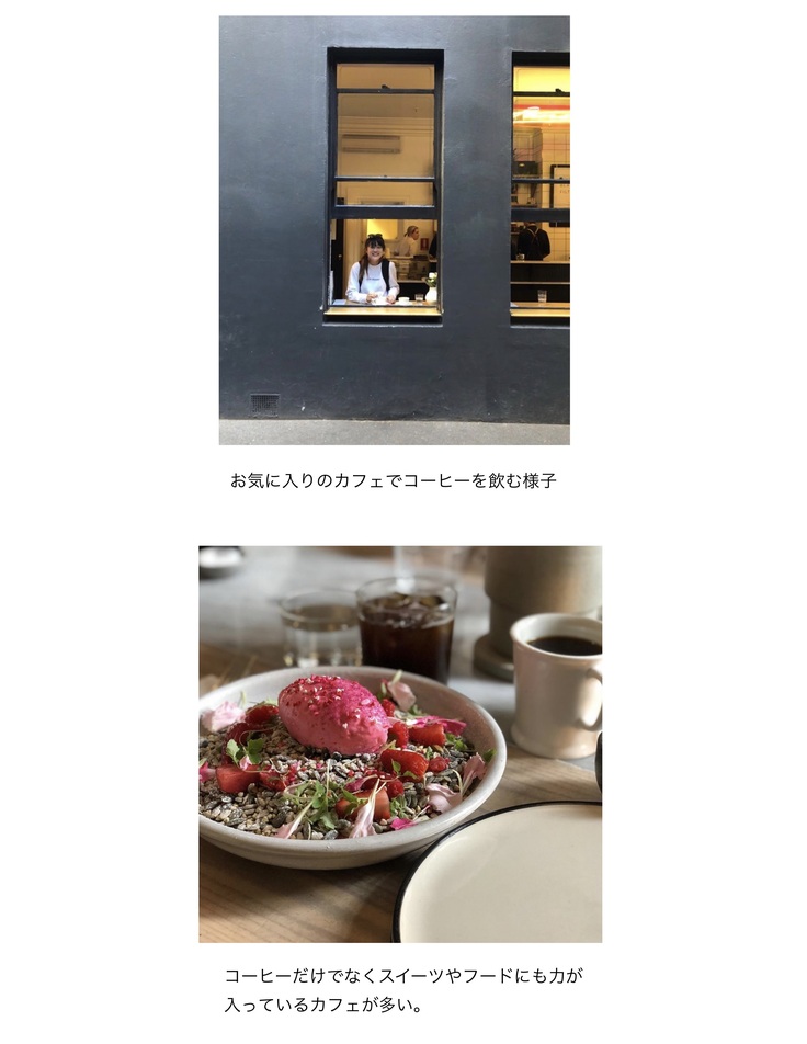 専門学校を卒業後、オーストラリアの地域密着でオシャレ、コーヒーの種類も豆だけでなく、ミルクの温度や泡の量を自分でカスタマイズするのがとても面白く実際に肌で感じてみたくてメルボルンへ。メルボルンはイタリアのコーヒー文化の影響を強く受けており、独自のカフェ文化があります。オーストラリア人は1日に3~4杯のコーヒーを飲むそうです!街には個人経営のカフェが多く存在します。朝、出勤前にコーヒーを買う人が多く、安くて高品質なコーヒーが簡単に手に入れることができます。街にはそれぞれのカフェは見ていてとても魅力的でおもしろかったです。そんな街を歩いているとのお気に入りのコーヒショップがみつかります。街にはそれぞれのカフェの楽しみ方をしている人がいます。子連れのファミリーで来る人もいて子供用には“ベビーチーノ”というミルクをスチーミングしたものにココアパウダーなどがかかっているものがあって子供も大人と一緒にカフェタイムするのがなんとも愛おしくて、私も将来は子供も楽しめるカフェを作りたいと思いました。