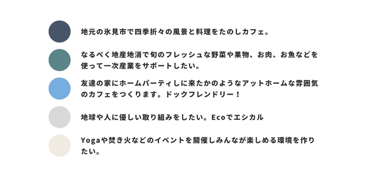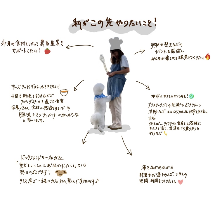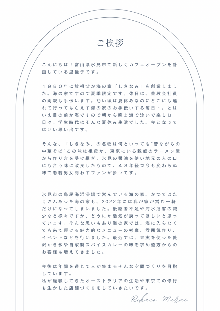富山と日本を一度離れ、富山の良さ、日本の良さをはじめて実感しました。生まれからずっと同じ場所にいると景色や食べ物が日常化されていました。海から昇る朝日のきれいさや、新鮮でおいしい魚や野菜を食べることができること。いかに自分が恵まれているかに気づきました。 そして、せっかくの海の見える立地で、自分のできること学んできたことを生かし、応援してくださる方や支えてくれる家族の力を借りながら、お客様が癒しの時間を過ごすことができたらと思っています。お客さんも楽しめて、自分たちも楽しく働けるように精進していきたいと思います。