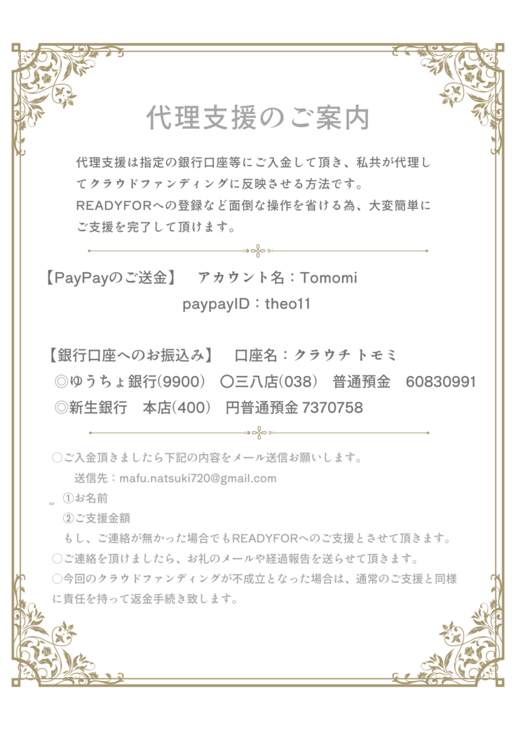 『代理支援』では銀行口座などにお振込みして頂き、当方で支援手続きを代行してクラウドファンディングに反映させます。