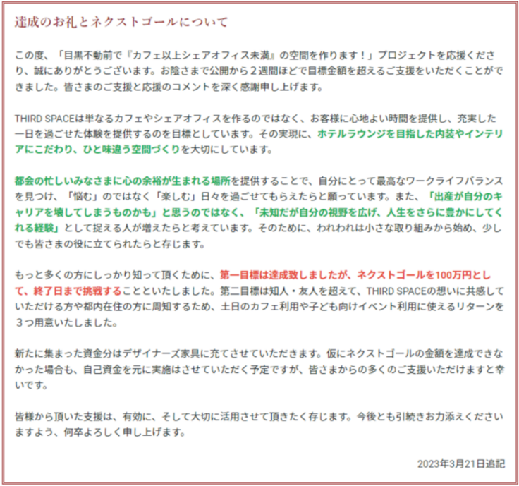 ※ご入金が確認でき次第、THIRD SPACEが代理でクラウドファンディングの決済手続きをさせていただきます。