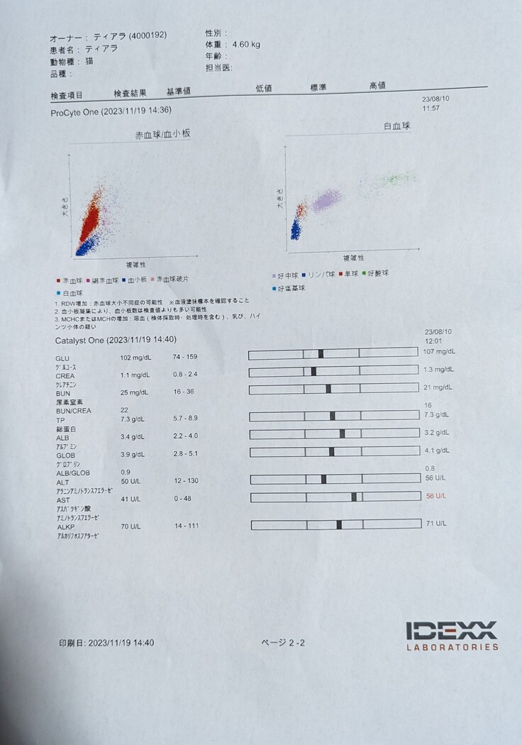 血液検査では肝臓の数値が全て基準内になり、A/G比も0.9と安心できる数値でした。