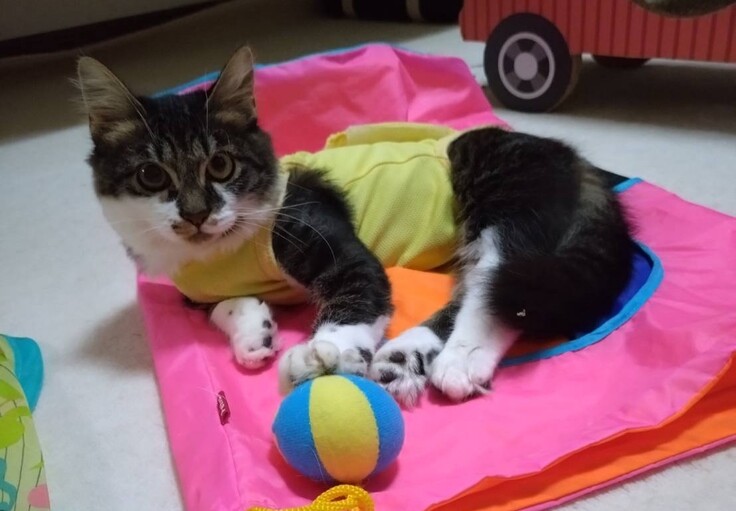 また、保健所収容時に事故で損傷していた3本の脚も順調に回復し、今は4本脚で立てるまでになりました。