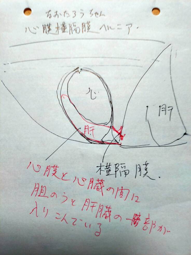 心臓と心膜の間に肝臓の一部と胆のうが入り込んでいる「心横隔膜ヘルニア」という、とても珍しく難しい症例でした。