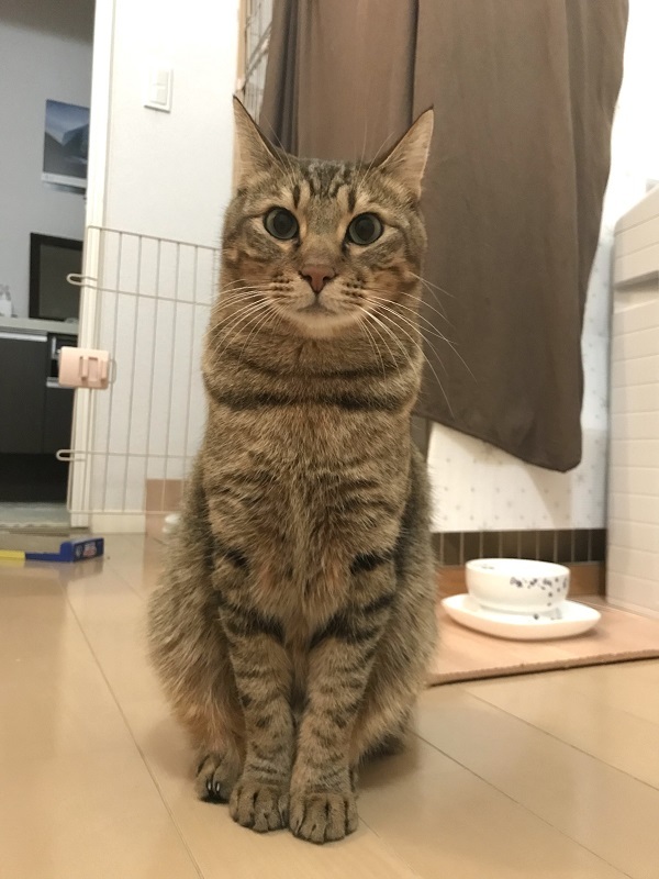 てて=食欲の固まり、と言っても過言ではないくらいで、自分のごはんを平らげた上によつばのごはんも奪い、さらには人間のご飯も狙います(よつばはててに甘いので全く怒りません)。将来おデブさんにならないか心配です。でも、猫じゃらしを振れば大ジャンプを見せ、毎日階段で運動会、と子猫らしく活発に動いています。
