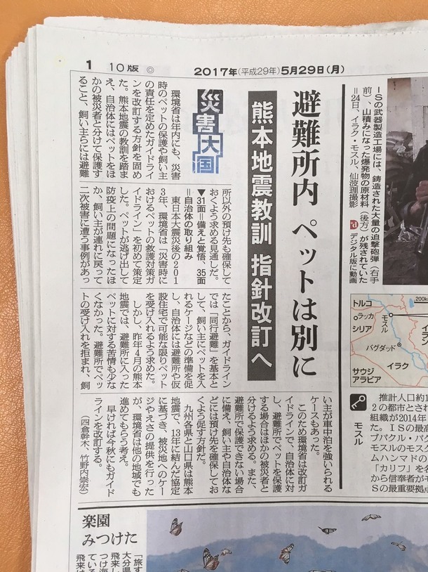 5月29日朝日新聞に「災害時ペット同行避難」に関する記事がありました。東日本大震災から熊本地震を教訓に人と動物が共存する為に何をしないといけないのかを考えていかなければなりません。
