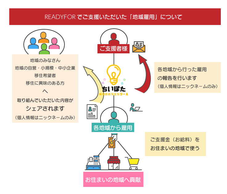 ※READYFOR記載の目標額には「手数料・運営費など」も含まれておりますので、「地域雇用」へのご支援金は、リタ-ンにて【地域雇用】をご選択ください。