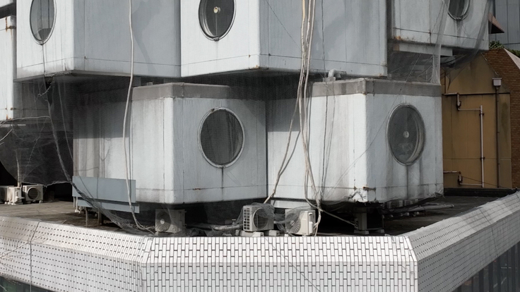 下記は、2022年3月末に、中銀カプセルタワービルA606プロジェクトがドローンで撮影した動画からの切り出しです。二枚目の右下がカプセルA306です。
