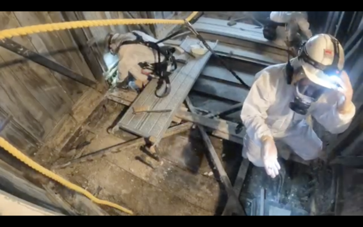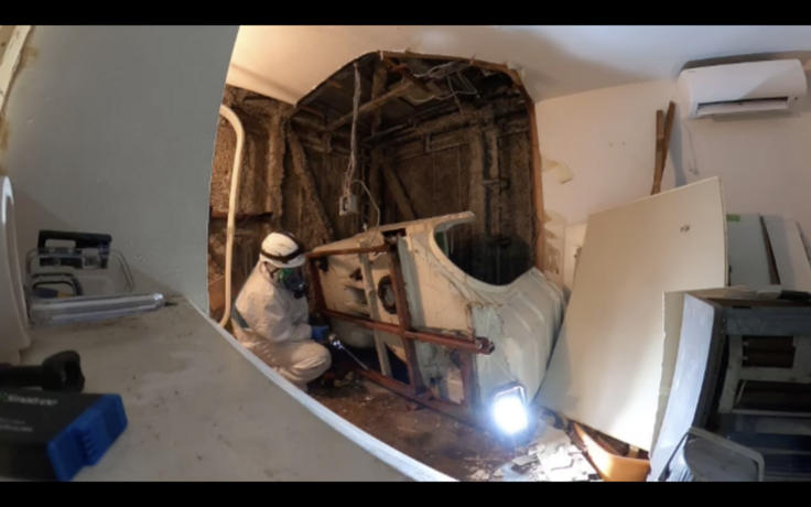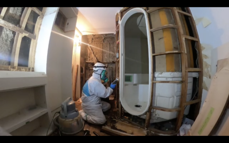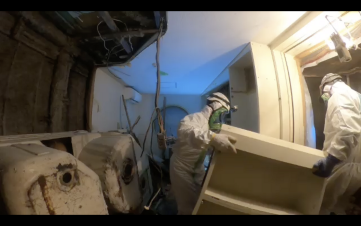 2022年4月後半、B棟のカプセル内では、すでに内装が解体撤去され床のALC版も外され、ほとんどのアスベストが取りのぞかれている状況でした。床のALC版の下にもアスベストがぎっしりと詰まっていたそうです。アスベスト除去作業は金ブラシなどを使用して手作業でおこなわれます。この時は、さいごの仕上げで丁寧にアスベストを掻きだしては手で集めて特別産廃の袋に集めるという作業が行われていました。仕上げは真空掃除機による吸引です。カプセルの端やユニットバスの裏にアスベストの塊があるので注意が必要といった内容の説明を私たちが主任者から受けているときの様子です。