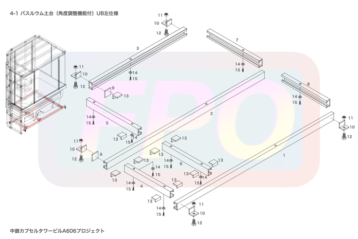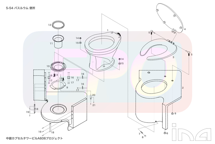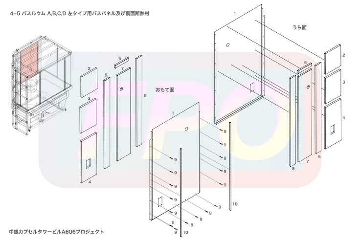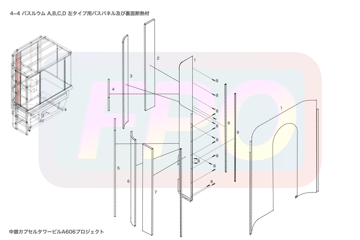 これらはカプセル内のバスルウムユニットを描いたパーツリストの一部ですが、バスルウムの鉄骨土台やバスパネルをネジ1本から全てのパーツを描いています。