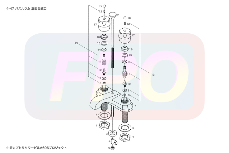 洗面台の水栓も、いまとは違う形のものから構成されている箇所もあるため、全てのパーツをばらして描いていますし、トイレも便器のカバーなど独特なパーツがあったり、いまではみかけない便座が使用されています。カバーを固定するネジも少し特殊なものですが、パーツリストがあれば、少なくとも現行の代用品が分かり、それを使うことで修繕が可能になります。