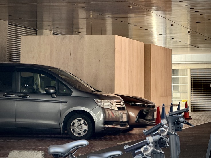 同日の3月9日には、SHUTLすぐ裏の駐車場に2個のカプセルらしき合板で包まれた物体が置かれていました。SHUTLの展示スペースから外に出され、アスベストがある状態で駐車場で「保管」、もしくは、「回収」や「廃棄」されるのを待っているようです。
