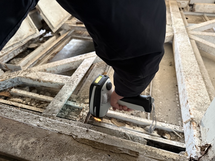 2025年2月21日。カプセルA606の外壁のアナライザーによる検査の様子。外壁では「Chrys」と表示され、アスベストの「クリソタイル(白石綿)」が検出されていた