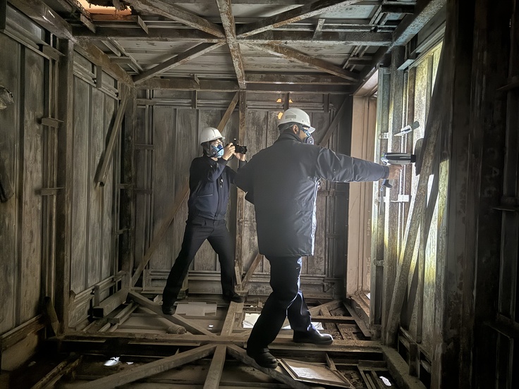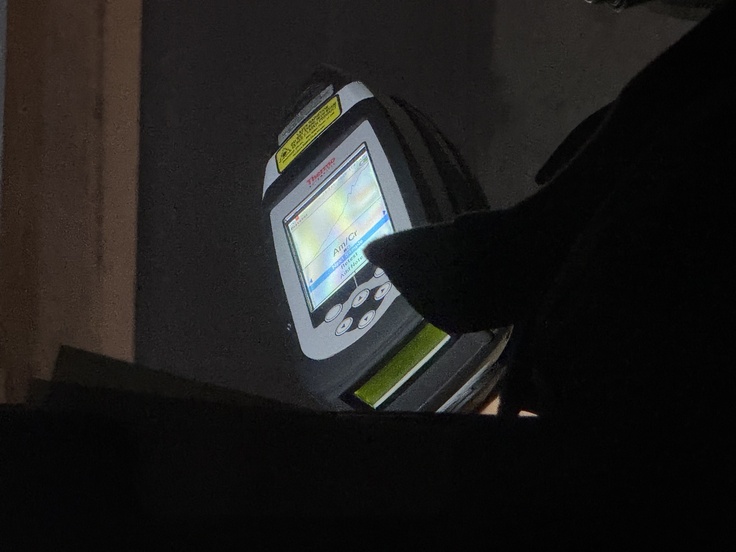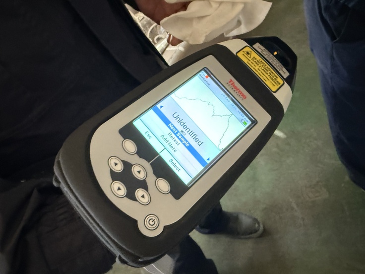 2025年2月21日、A606プロジェクトのカプセルを保管する倉庫で労基によるアスベストの検査。写真の範囲のカプセルA606の床パネルでは、アナライザーによるとアスベストは検出されなかった。「Undentified(アスベスト未確認)」の文字が表示されている