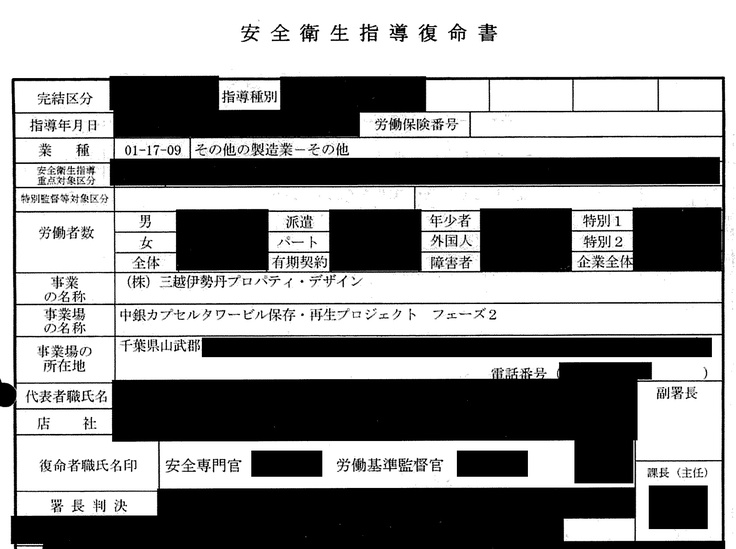 2023年2月に行われた「中銀カプセルタワービル保存・再生プロジェクト」の検査に対する「安全衛生指導復命書」