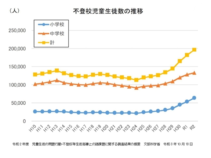 文科省が令和3年10月に発表した資料によると、令和2年の全国の不登校児童生徒数は19万6000人、うち中学生は全体の約2/3を占め、年々増加の一途をたどっています。