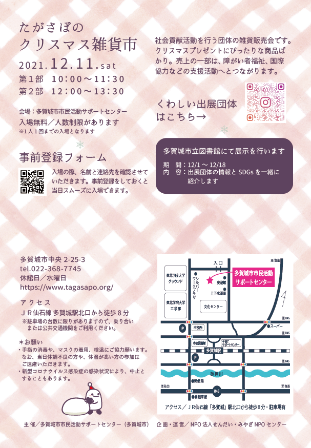 タイトルにもありますように明日12月11日土曜日、宮城県多賀城市の市民活動サポートセンターにて「クリスマス雑貨市」が開かれます。