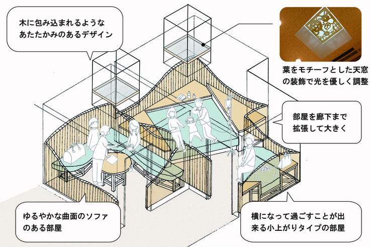 2つある家族控室のうち、一つは横になってリラックスしながら過ごすことが出来る小上がりタイプの部屋、もう一つはゆるやかな曲面のソファのある部屋で、利用目的や状況に応じて使い分けたいと考えています。天窓には、優しく光を調整する植物の模様を施したいと考えています。