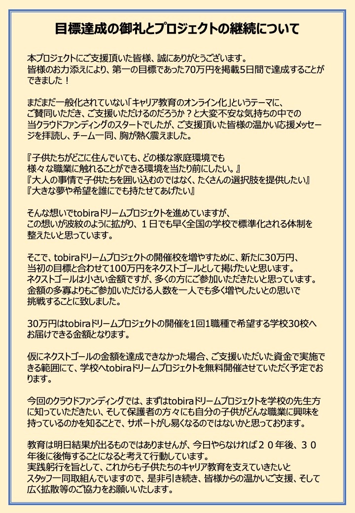 学校の先生/教育委員会様向け『tobiraドリームプロジェクト』の実施 ●2023年2月、2023年3月 計2回開催費用 20万円 ●2023/4/1-2024/3/31 希望する学校でのトライアル開催 100校 150万円 ●2023/4/1-2024/3/31 継続を希望する学校での年間開催費用 1校10万円 ●2023/4/1-2024/3/31 保護者会/自治会/PTA会/生徒・子供会などでの個別開催時の講師登壇料 1回2万円 ●2023/4/1-2024/3/31 企業向け研修開催時の講師登壇料 1回5万円 プロフェッショナルの登壇料、イベント開催オペレーション費用に充てさせていただきます。 また、達成金額を超えた場合は、開催希望校の開催費用にさせていただきます。