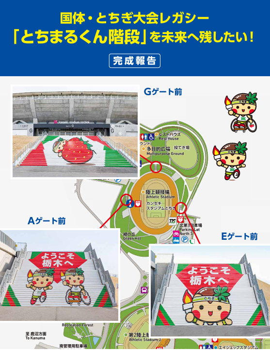 令和6年11月20日にスタートした 【国体・とちぎ大会レガシー「とちまるくん階段」を未来へ残したい!】が、令和7年1月10日までに194名4,775,000円もの本当に多くのご支援を頂き,「とちまるくん階段」をA・E・G階段3箇所に設置することが出来ました。