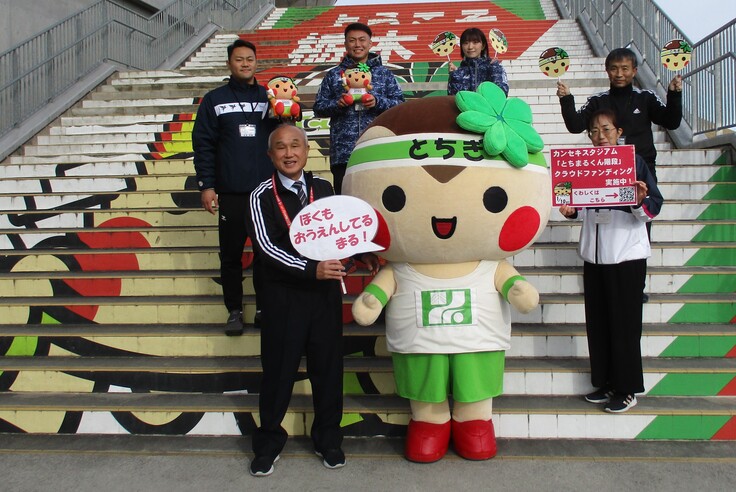 とちまるくんも目標額80%達成のお祝いにかけつけてくれました!一緒に記念撮影!