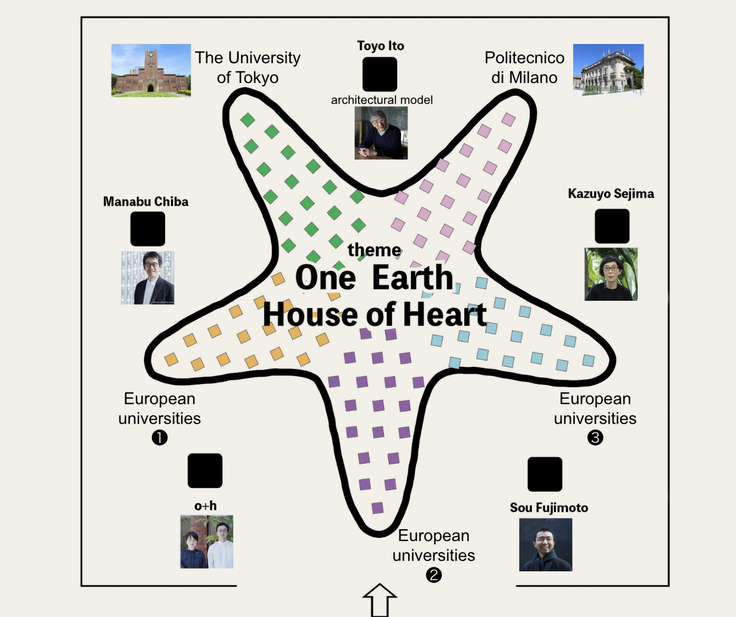 内容:伊東豊雄氏監修・指導の国際クリエイティブワークショップを各国で実施。各国チームが各大学教授の指導のもと ティーチングアシスタント学生がマンツーマンで小学生20人とテーマの「One Earth-こころの家」の建築模型を制作。 ミラノの会場に全100の作品を持ち込み完成させる。更にその島を囲むように、建築家5名がエール(模型作品展示)を送ります。