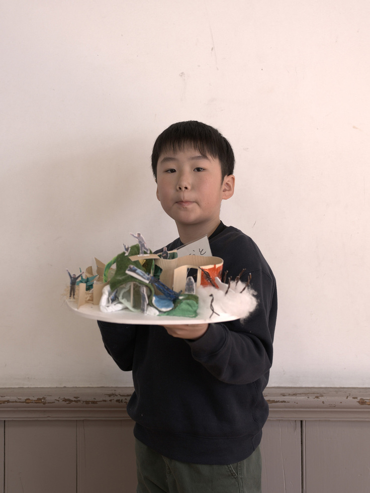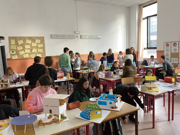 教室には紙・木・粘土・布・テープなど約100種類の素材が揃っており、子どもたちはそれらを自由に組み合わせながら模型を制作します。切ったり貼ったり試行錯誤しながら、アイデアを立体の建築模型へと仕上げていきます。