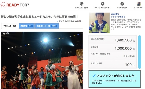 今回は、震災から4年も経過した中での3度目のミュージカルということで、みなさまからの賛同を得られるか不安もありました。しかし、予想を大きく上回る応援の声を頂けたことは、このミュージカルの行う意義や必要性をあらためて強く認識することができました。