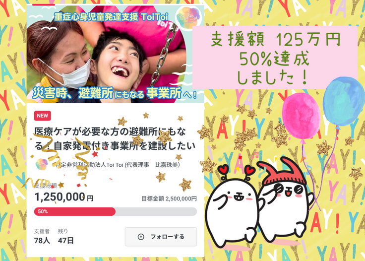 令和5年9月14日15時58分現在の支援金総額が、125万円と目標金額の50%を達成いたしました。