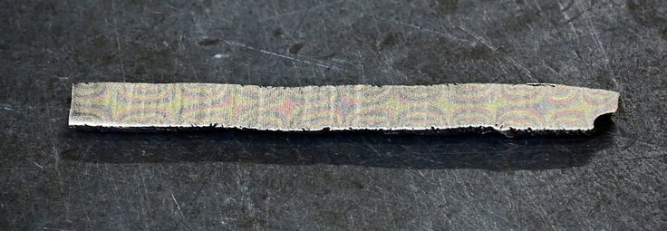 実体顕微鏡で観察した日本刀断面。薬品で表面を処理しており,中心部に軟らかい鋼(心鉄)が確認できます。