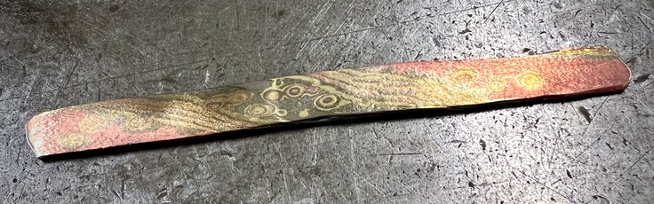 現在は、耐熱鋼や自動車フレーム用高強度鋼などの最新の科学的な研究とともに、日本の伝統的な金属工芸品の科学的研究も実施中。写真は、江戸時代に日本刀の鍔(つば)を製作する職人によって考案されたとされ、一時は技術が途絶え幻の技術とされていた杢目金を研究室で学生と再現したものとなり,現在科学的に分析中。
