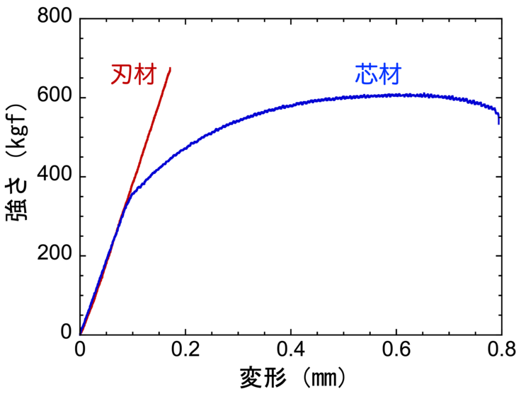 これは金属の最も基本的な強さを調べた引張試験の結果となっています。この分析は刃先と中心部から採取したサンプルの強さを調べたもので、サンプルを引張り、引張ることで生じた変形を横軸、引張るために必要となった力を縦軸に示しています。