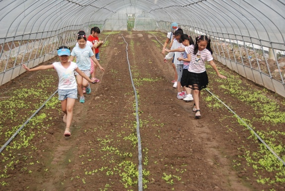 (上海市崇明島の小学生の環境教育学習の様子。地元の畑見学です)